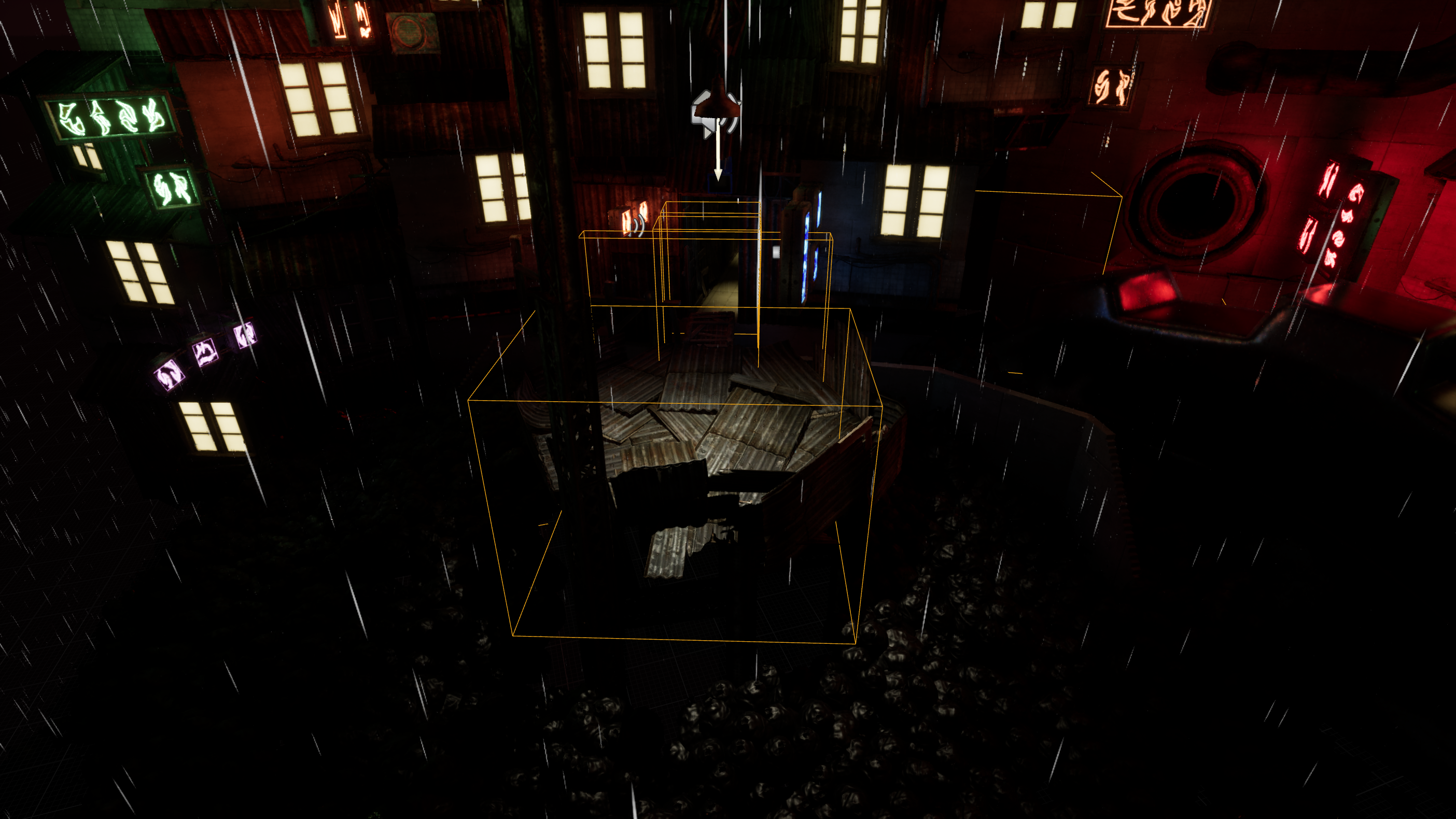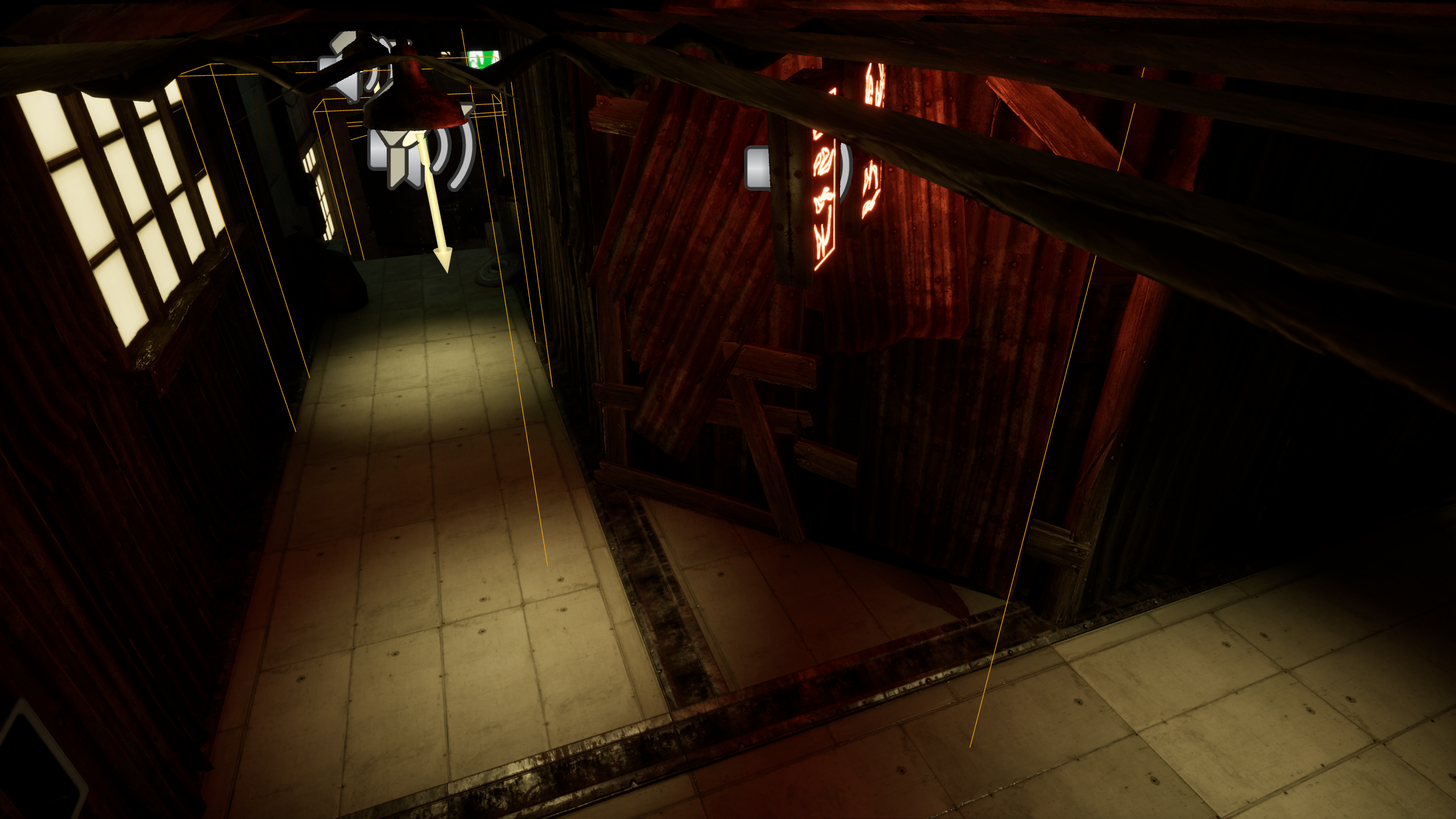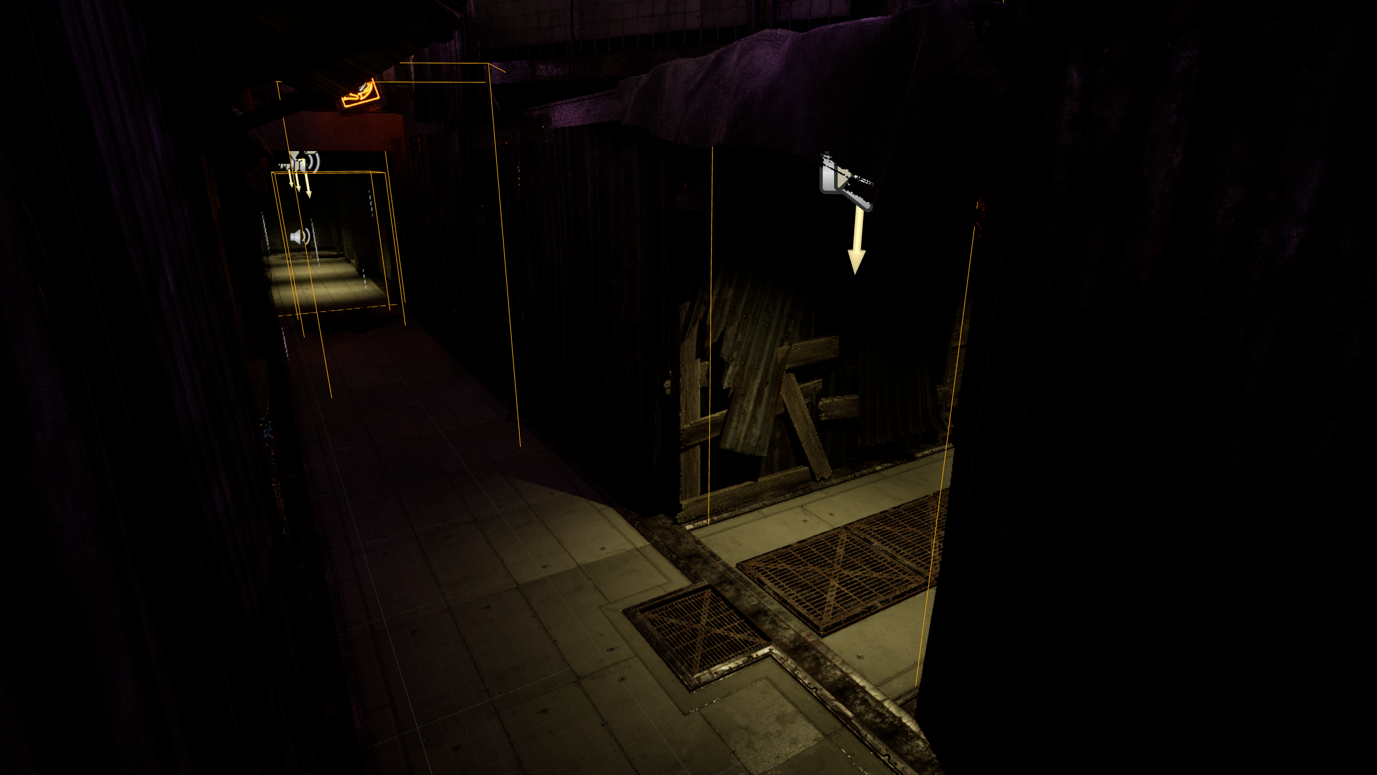 Examples of audio gameplay volumes used for spatial filters/FX and triggers for audio cues. Attenuated audio cues used for looping ambience.